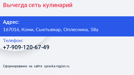 Вычегда, сеть кулинарий по адресу 167016, Коми, Сыктывкар, Оплеснина, 58а в дальнейшем Организация, размещена в следующих категориях: