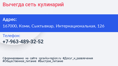 Вычегда, сеть кулинарий по адресу 167000, Коми, Сыктывкар, Интернациональная, 126 в дальнейшем Организация, размещена в следующих категориях: