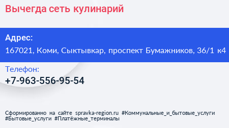 Вычегда, сеть кулинарий по адресу 167021, Коми, Сыктывкар, проспект Бумажников, 36/1 к4 в дальнейшем Организация, размещена в следующих категориях: