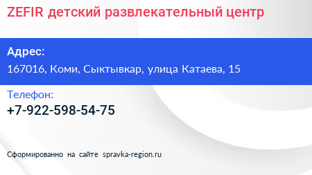 ZEFIR, детский развлекательный центр по адресу 167016, Коми, Сыктывкар, улица Катаева, 15 в дальнейшем Организация, размещена в следующих категориях: