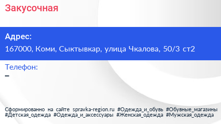 Закусочная по адресу 167000, Коми, Сыктывкар, улица Чкалова, 50/3 ст2 в дальнейшем Организация, размещена в следующих категориях: