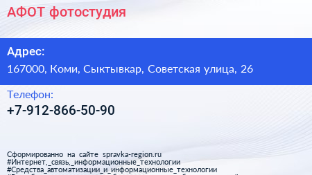 АФОТ, фотостудия по адресу 167000, Коми, Сыктывкар, Советская улица, 26 в дальнейшем Организация, размещена в следующих категориях:
