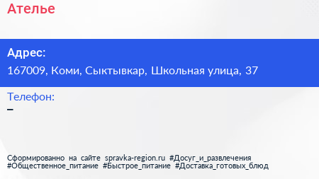 Ателье по адресу 167009, Коми, Сыктывкар, Школьная улица, 37 в дальнейшем Организация, размещена в следующих категориях: