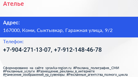 Ателье по адресу 167000, Коми, Сыктывкар, Гаражная улица, 9/2 в дальнейшем Организация, размещена в следующих категориях: