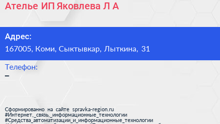 Ателье, ИП Яковлева Л.А. по адресу 167005, Коми, Сыктывкар, Лыткина, 31 в дальнейшем Организация, размещена в следующих категориях:
