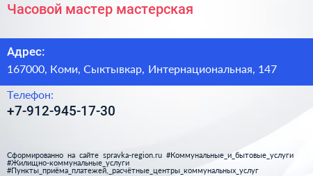 Часовой мастер, мастерская по адресу 167000, Коми, Сыктывкар, Интернациональная, 147 в дальнейшем Организация, размещена в следующих категориях: