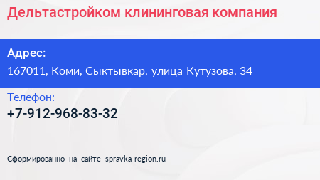 Дельтастройком, клининговая компания по адресу 167011, Коми, Сыктывкар, улица Кутузова, 34 в дальнейшем Организация, размещена в следующих категориях:
