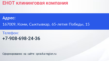 ЕНОТ, клининговая компания по адресу 167009, Коми, Сыктывкар, 65-летия Победы, 15 в дальнейшем Организация, размещена в следующих категориях: