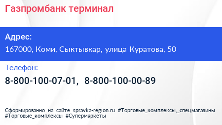 Газпромбанк, терминал по адресу 167000, Коми, Сыктывкар, улица Куратова, 50 в дальнейшем Организация, размещена в следующих категориях: