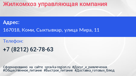 Жилкомхоз, управляющая компания по адресу 167018, Коми, Сыктывкар, улица Мира, 11 в дальнейшем Организация, размещена в следующих категориях: