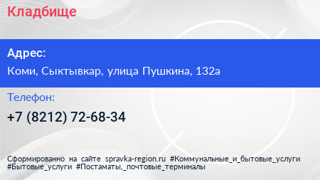 Кладбище по адресу Коми, Сыктывкар, улица Пушкина, 132а в дальнейшем Организация, размещена в следующих категориях:
