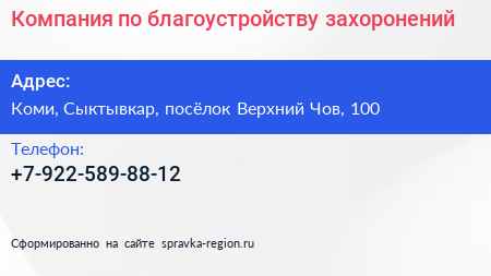 Компания по благоустройству захоронений по адресу Коми, Сыктывкар, посёлок Верхний Чов, 100 в дальнейшем Организация, размещена в следующих категориях: