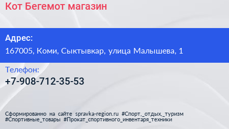Кот Бегемот, магазин по адресу 167005, Коми, Сыктывкар, улица Малышева, 1 в дальнейшем Организация, размещена в следующих категориях: