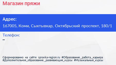 Магазин пряжи по адресу 167005, Коми, Сыктывкар, Октябрьский проспект, 180/1 в дальнейшем Организация, размещена в следующих категориях: