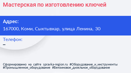 Мастерская по изготовлению ключей по адресу 167000, Коми, Сыктывкар, улица Ленина, 30 в дальнейшем Организация, размещена в следующих категориях: