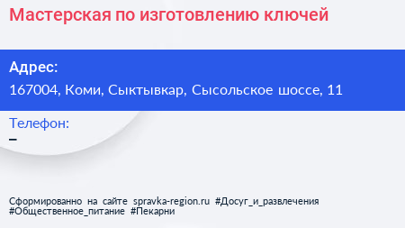 Мастерская по изготовлению ключей по адресу 167004, Коми, Сыктывкар, Сысольское шоссе, 11 в дальнейшем Организация, размещена в следующих категориях: