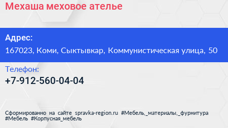 Мехаша, меховое ателье по адресу 167023, Коми, Сыктывкар, Коммунистическая улица, 50 в дальнейшем Организация, размещена в следующих категориях: