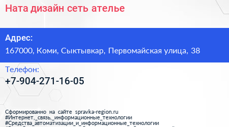 Ната-дизайн, сеть ателье по адресу 167000, Коми, Сыктывкар, Первомайская улица, 38 в дальнейшем Организация, размещена в следующих категориях: