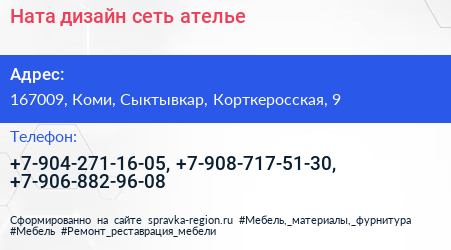 Ната-дизайн, сеть ателье по адресу 167009, Коми, Сыктывкар, Корткеросская, 9 в дальнейшем Организация, размещена в следующих категориях: