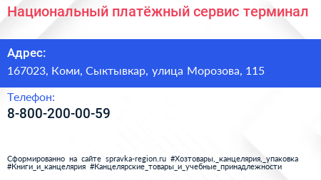 Национальный платёжный сервис, терминал по адресу 167023, Коми, Сыктывкар, улица Морозова, 115 в дальнейшем Организация, размещена в следующих категориях: