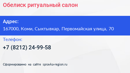 Обелиск, ритуальный салон по адресу 167000, Коми, Сыктывкар, Первомайская улица, 70 в дальнейшем Организация, размещена в следующих категориях: