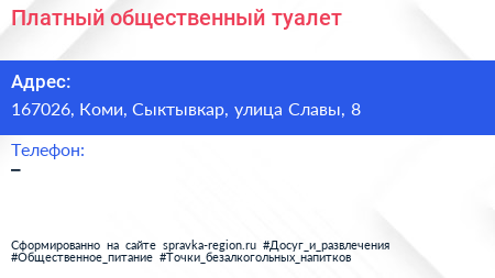 Платный общественный туалет по адресу 167026, Коми, Сыктывкар, улица Славы, 8 в дальнейшем Организация, размещена в следующих категориях: