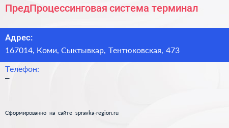 ПредПроцессинговая система, терминал по адресу 167014, Коми, Сыктывкар, Тентюковская, 473 в дальнейшем Организация, размещена в следующих категориях: