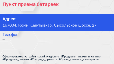 Пункт приема батареек по адресу 167004, Коми, Сыктывкар, Сысольское шоссе, 27 в дальнейшем Организация, размещена в следующих категориях: