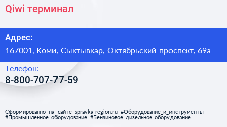 Qiwi, терминал по адресу 167001, Коми, Сыктывкар, Октябрьский проспект, 69а в дальнейшем Организация, размещена в следующих категориях: