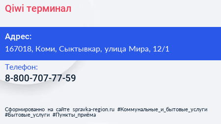 Qiwi, терминал по адресу 167018, Коми, Сыктывкар, улица Мира, 12/1 в дальнейшем Организация, размещена в следующих категориях: