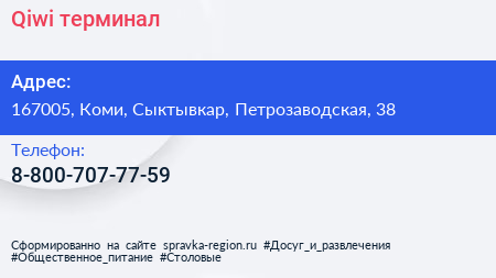 Qiwi, терминал по адресу 167005, Коми, Сыктывкар, Петрозаводская, 38 в дальнейшем Организация, размещена в следующих категориях: