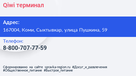 Qiwi, терминал по адресу 167004, Коми, Сыктывкар, улица Пушкина, 59 в дальнейшем Организация, размещена в следующих категориях:
