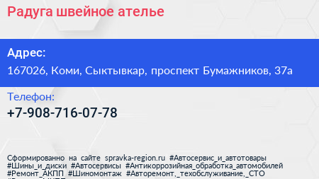 Радуга, швейное ателье по адресу 167026, Коми, Сыктывкар, проспект Бумажников, 37а в дальнейшем Организация, размещена в следующих категориях: