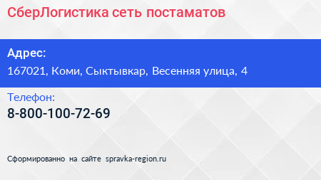 СберЛогистика, сеть постаматов по адресу 167021, Коми, Сыктывкар, Весенняя улица, 4 в дальнейшем Организация, размещена в следующих категориях: