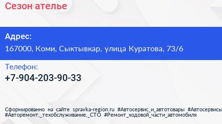 Сезон, ателье по адресу 167000, Коми, Сыктывкар, улица Куратова, 73/6 в дальнейшем Организация, размещена в следующих категориях:
