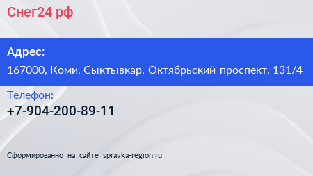 Снег24.рф по адресу 167000, Коми, Сыктывкар, Октябрьский проспект, 131/4 в дальнейшем Организация, размещена в следующих категориях:
