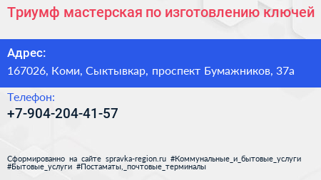 Триумф, мастерская по изготовлению ключей по адресу 167026, Коми, Сыктывкар, проспект Бумажников, 37а в дальнейшем Организация, размещена в следующих категориях:
