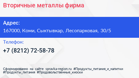 Вторичные металлы, фирма по адресу 167000, Коми, Сыктывкар, Лесопарковая, 30/5 в дальнейшем Организация, размещена в следующих категориях: