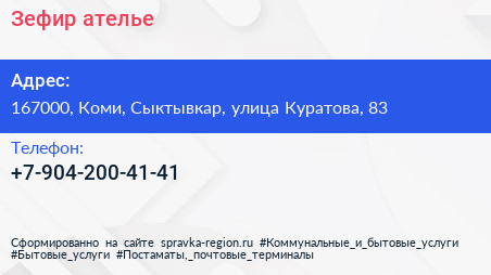 Зефир, ателье по адресу 167000, Коми, Сыктывкар, улица Куратова, 83 в дальнейшем Организация, размещена в следующих категориях: