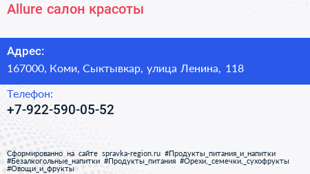 Allure, салон красоты по адресу 167000, Коми, Сыктывкар, улица Ленина, 118 в дальнейшем Организация, размещена в следующих категориях:
