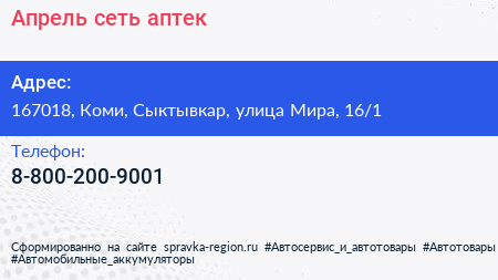 Апрель, сеть аптек по адресу 167018, Коми, Сыктывкар, улица Мира, 16/1 в дальнейшем Организация, размещена в следующих категориях: