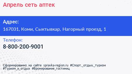 Апрель, сеть аптек по адресу 167031, Коми, Сыктывкар, Нагорный проезд, 1 в дальнейшем Организация, размещена в следующих категориях: