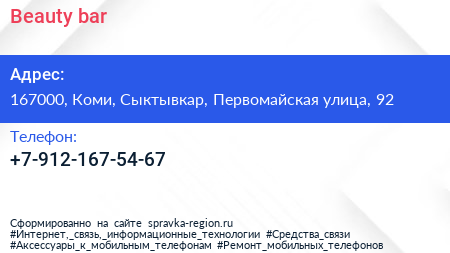 Beauty bar по адресу 167000, Коми, Сыктывкар, Первомайская улица, 92 в дальнейшем Организация, размещена в следующих категориях: