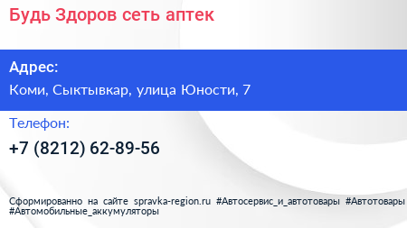 Будь Здоров, сеть аптек по адресу Коми, Сыктывкар, улица Юности, 7 в дальнейшем Организация, размещена в следующих категориях: