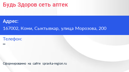 Будь Здоров, сеть аптек по адресу 167002, Коми, Сыктывкар, улица Морозова, 200 в дальнейшем Организация, размещена в следующих категориях: