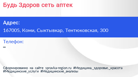 Будь Здоров, сеть аптек по адресу 167005, Коми, Сыктывкар, Тентюковская, 300 в дальнейшем Организация, размещена в следующих категориях: