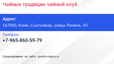 Чайные традиции, чайный клуб по адресу 167000, Коми, Сыктывкар, улица Ленина, 43 в дальнейшем Организация, размещена в следующих категориях: