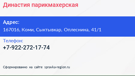 Династия, парикмахерская по адресу 167016, Коми, Сыктывкар, Оплеснина, 41/1 в дальнейшем Организация, размещена в следующих категориях:
