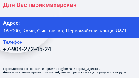Для Вас, парикмахерская по адресу 167000, Коми, Сыктывкар, Первомайская улица, 86/1 в дальнейшем Организация, размещена в следующих категориях:
