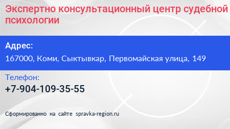 Экспертно-консультационный центр судебной психологии по адресу 167000, Коми, Сыктывкар, Первомайская улица, 149 в дальнейшем Организация, размещена в следующих категориях: